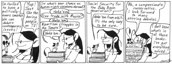 Yeah, more defanged political humor. But you know, about five years after this strip was drawn, when the Bush administration tried to tackle the issue of Social Security for the Baby Boom generation, I’m pretty sure this was the actual plan. I’m prescient!
