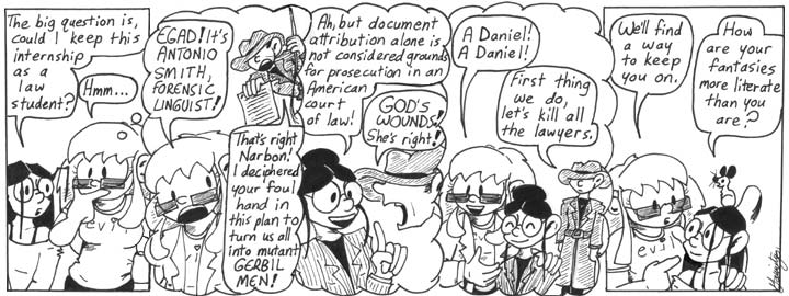 The five-panel strips are always way too cramped, but I like this one anyway, for the gratuitous Shakespeare and Artie’s final line. “A Daniel! A Daniel!” is Shylock’s courtroom cry in The Merchant of Venice. “The first thing we do, let’s kill all the lawyers” is from Henry VI. This will come up again, but for some reason The Merchant of Venice ended up being the Shakespearean play most often quoted in Narbonic. Maybe because it’s got the most sympathetic villain.