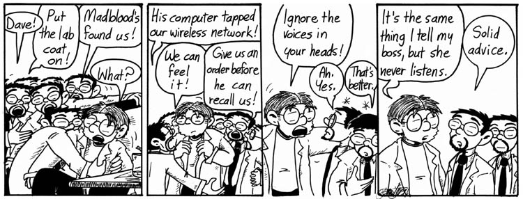 Tape? Who uses tape anymore? If Shaenon were updating the technology references, Zeta would be using a digital voice recorder … and in six years, when Narbonic: Special Edition Blu-Ray comes out, she’ll have a micro-aural implant with 50 gigabyte/sec uplink to the blogo-cloud …
