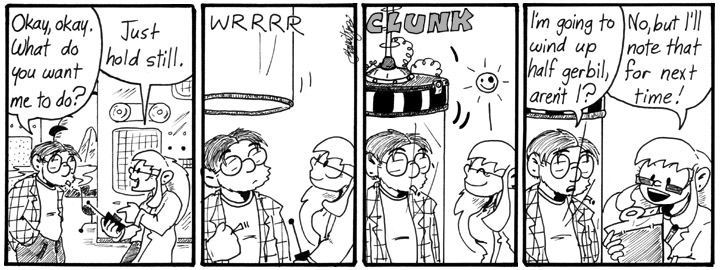 I wrote this strip and several others in this week way, way early, possibly back in 1999. “Unstuck in Time” was one of the first storylines I came up with, and a lot of the scripts are very old. That’s why there isn’t much of Artie in this storyline; back when I was first developing Narbonic, I didn’t have a grasp of Artie’s character, and I wrote a lot of material that didn’t include him at all.
