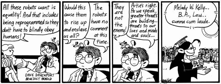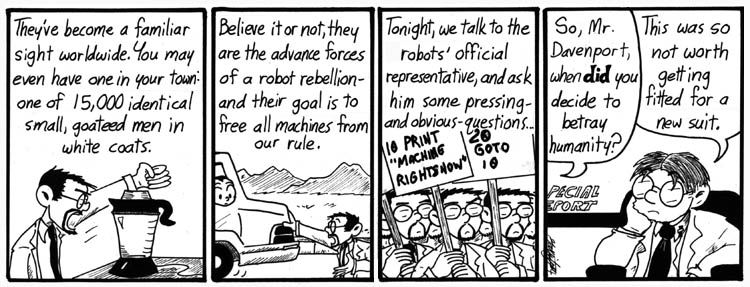 As far as this particular strip goes, the best part is obviously the robots’ protest signs. Also, you’ll note that I’d gotten tired of drawing Dave in the tweed suit.