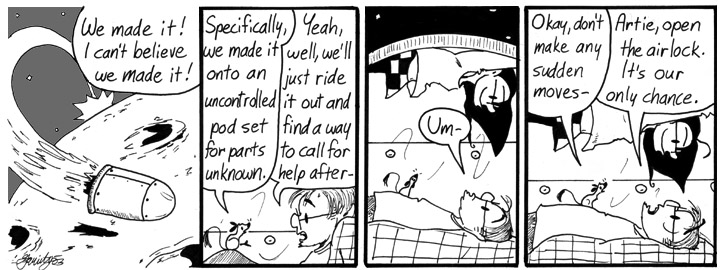 This is, of course, based on the ending of the original “Alien,” an awesome movie. The art looks pretty good in this one, especially the first panel. It turns out I’m good at drawing the surface of the moon.
