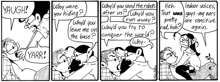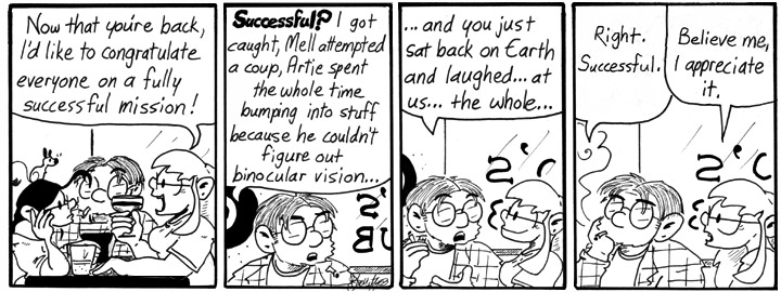 Dave’s line in the last panel was originally longer, and I shortened it at the last minute to, “Right. Successful.” That’s why the word balloon is so big.