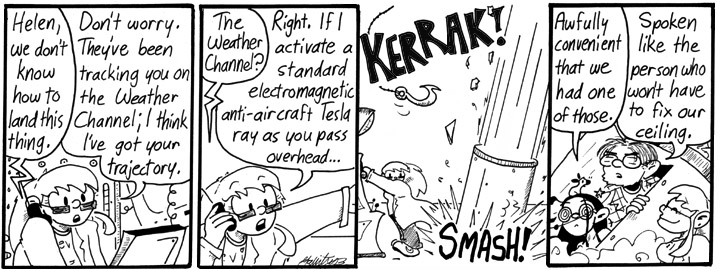There are times when the limits of my drawing style produce amusing effects, and I think the third panel here is one of those times. Yes, that’s the best drawing of a space pod crashing into Helen’s underground lab I could manage.
