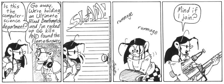 Looking at this strip again, I’ve changed my mind. My actual favorite detail is the teeny tiny comic strips the CS guys have taped to their door.