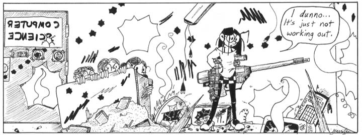 My lettering is nigh-illegible here, especially in that last panel, but this is actually a pretty entertaining conversation. Mell expresses a twinge of emotion about Dave’s death, which is a big thing for her. On the whole, Mell is kind of uncomfortable and out of her element when it comes to choosing a major. As she said in the previous strip, she’d be much happier if she could just shoot things, as she in fact manages to do by the end of the week.