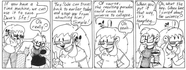 Wednesday’s Comic: Why do so many people imagine that creating a causality paradox has the effect of shutting down the entire universe? It’s almost as if they consider causation to be a Trek-era robot that responds to such problems with howls of “DOES NOT COMPUTE” before spontaenously combusting.