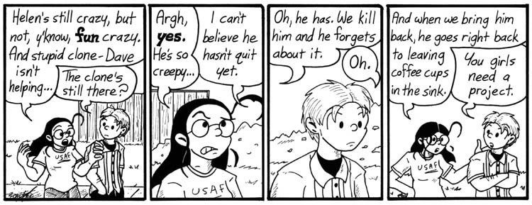 This whole week of strips was T Campbell’s idea. Much earlier in this storyline, he emailed me to say that he felt I hadn’t done enough to develop the idea that Helen would be unstable (well, more so than usual) without Dave around, and I needed to dramatize it instead of just having Mell talk about it. He was right! Hence this week.