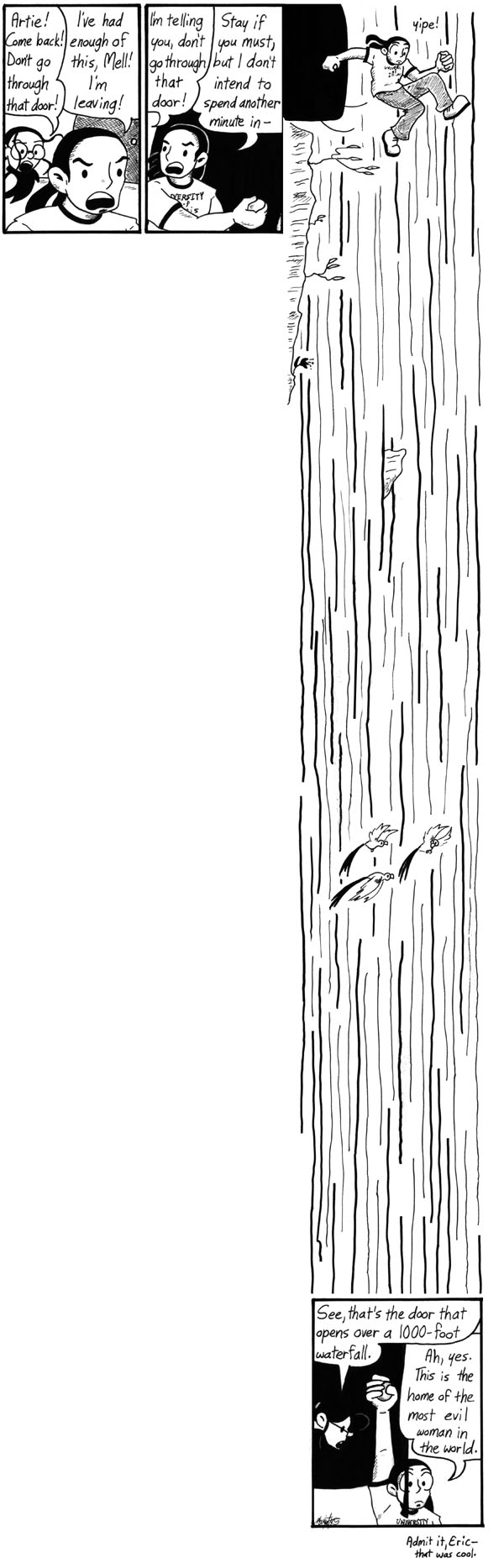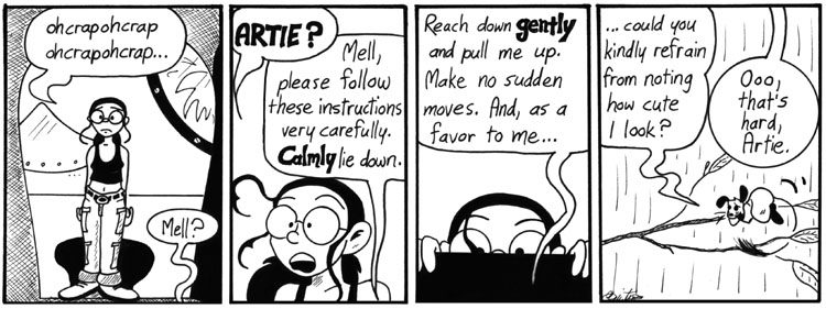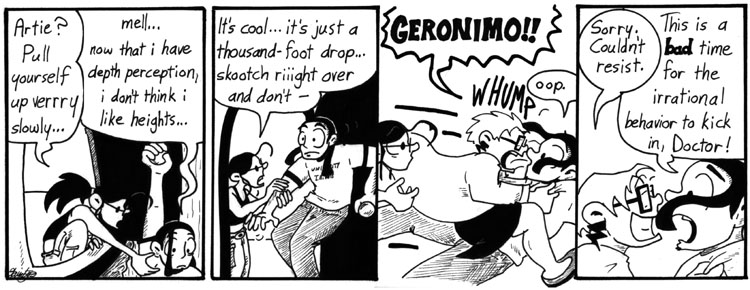 Artie’s fear of heights, at least when he’s in human form, comes up later. At this point I was getting close to the end of the strip and didn’t have space to build up a lot of additional foreshadowing, but one little detail couldn’t hurt, right?