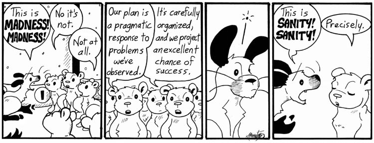 I wrote this one early on, probably right after I had the idea of the flying hamster island. I remember it being in my Big Folder of Notebook-Paper Thumbnails for ages. I never thought it was all that funny, but the dialogue is very, very in-character for Artie, especially the annoyed little aside about not being born. I love writing that guy.