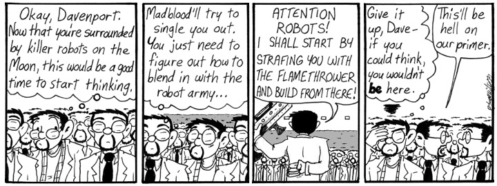 I know I’ve said this before, but I love the way Dave and Madblood play off each other. [SPOILERS] I think the key is that they’re very similar people except that one of them is an arrogant supergenius and the other one is just a developing arrogant supergenius. Much later in the strip, I had Dave go work for Madblood because I enjoyed the buddy-movie vibe so much.