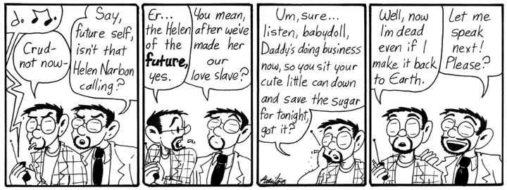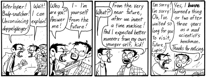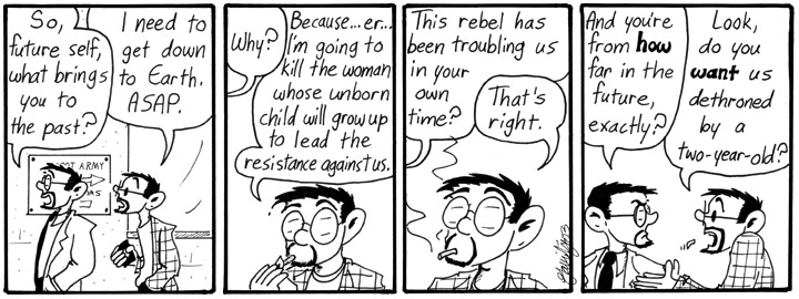 Fourth walls were meant to be broken. And time travel stories allow you to break the fifth wall and make snarky comments about strips that haven’t appeared yet!