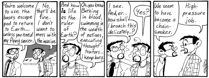 Personally, I think I showed a lot of restraint by only drawing this subterfuge out for a week. And only breaking the fourth wall in every other strip. Thank you.
