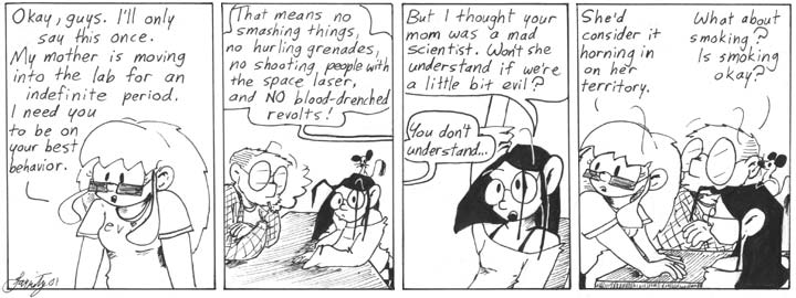 Typically, as the Narbonic webcomic progressed, one would expect more and more hideous beings would become entwined with our vile band, and each storyline would feature an increasingly crowded conference table, to the point that by 2006 Dave’s absense after “The End” would go unnoticed amidst the throng of gerbil-humanoids, yoghurt-humanoids, demons, robots, Venusians and nightmares made flesh that have gathered around it. It would be an even more evident case of Webcomic Weirdness Acumulation (which, so far, this comic is only exhibiting in forgivable levels).