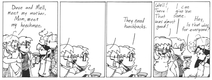 As regards the wineglass on the Thursday strip, I actually kind of like the positioning. It looks vaguely like Helen’s mother is chucking Mell under the chin with it, the way that you might lift a child’s or an animal’s head to get a better look at it. (The gesture is also often used in a more romantic manner, generally a guy doing it to a girl, but I sincerely doubt that applies here)