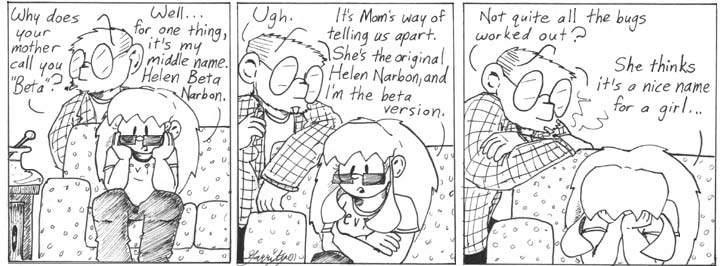 Friday’s Comic: I don’t quite understand the logic of naming the successor to the Narbon name “Beta”. Or at least, not in the software context presented by this strip, which seems to assert that Dr. Narbon is Helen Alpha, and that Alpha and Beta will be succeeded by the final, release version of Helen Narbon.