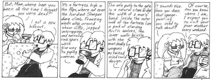 Taking later developments into account, that last panel is more ambiguous than it seems. Probably more than Artie realizes; he’s not really comfortable thinking about sex yet. For the record, at this point in the strip I thought of Artie as bisexual. He kind of kept sliding up the Kinsey scale as his character developed in my mind.
