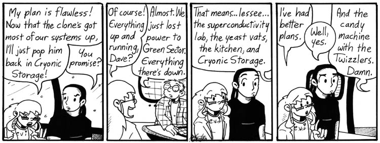 This is another of the last strips written for this storyline, just to keep the plot making sense, but it fits in pretty nicely. I have no idea how large Narbonics Labs is or how it’s organized, but this week of strips mentioned a Blue Sector, so I decided to use Green Sector here. The yeast vats are a reference to Jeffrey Wells’s Very Long Fanfic, which has a lot of yogurt in it.