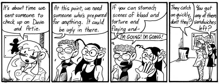 @everyone: Thanks for the positive comments, but remember this is, first and foremost, Shaenon’s work. She spends hours putting together some clever writing and art, and I spend a few minutes twisting and distorting it into a sick, deformed perversion of her craft.
