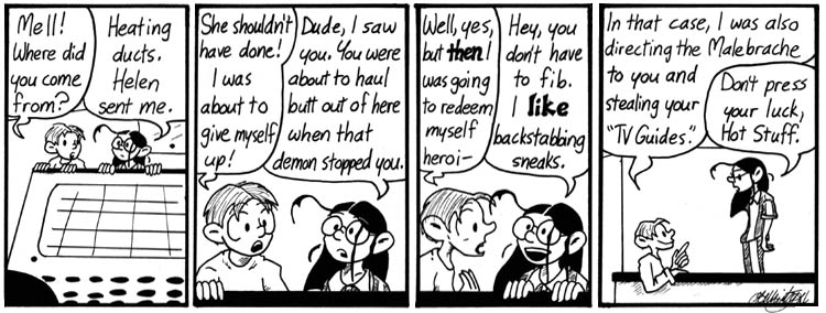 Mell calls Caliban “Hot Stuff” as a reference to Hot Stuff, The Little Devil, but also to him being hot. I worried about this ambivalence, but in the end I decided to leave the line in. Way, way back in the earliest days of Modern Tales, Joey Manley fantasized about getting the rights to Harvey Comics and making all the Modern Tales artists draw their versions of the characters. I think I was supposed to draw either Hot Stuff or Wendy the Good Little Witch.