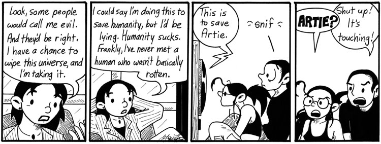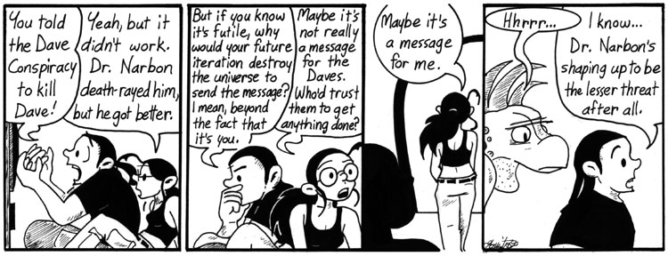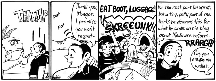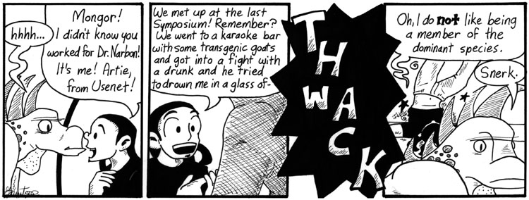 Artie’s anecdote was loosely based on the adventures of some of my friends at a comic convention. I like this strip a lot, partly because Artie came out really well in the last panel–at the time, I still had a lot of trouble drawing full-body shots of him–and partly because I just like Mongor. I don’t even mind that Mongor looks different in every damn panel in this storyline.