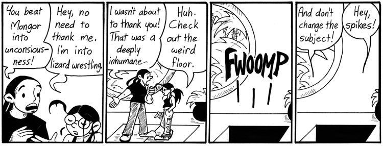 I have a confession to make: I get a little thrill out of seeing cartoon people fall through trapdoors, and am a little bit disappointed at how the author’s finger was just a second too late in clicking the shutter when photographing panel 3.