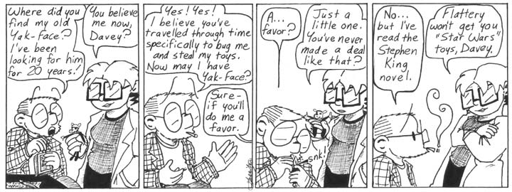 Poor, dumb Dave. I like how, in this week of strips, he knows he’s doing something really, really stupid, but he keeps going ahead with it anyway, because he wants that damn toy. I probably could have played this up more than I did; it’s the basic source of whatever humor these strips have.