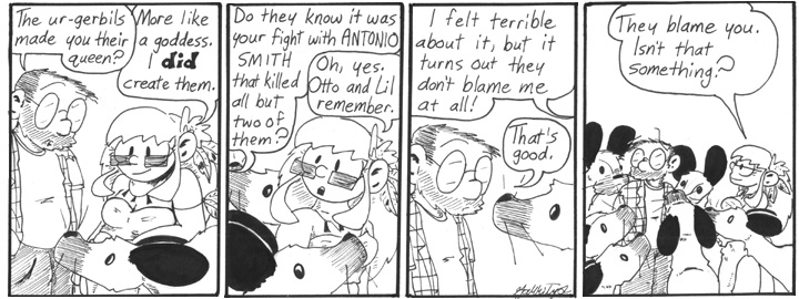 I like the gerbil worrying Dave’s flannel in the first panel. Really, the ur-gerbils are great. Who doesn’t enjoy freakishly oversized rodents?