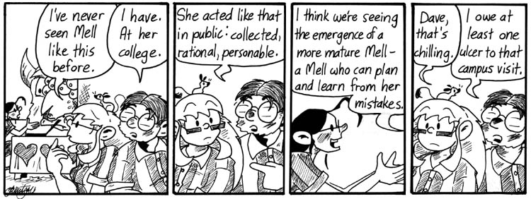 Mell’s one of the flatter characters in Narbonic, but it was nice to be able to develop her character a little, mostly in the background of the story, to the point that it was plausible for her to become a lawyer, have a more-or-less-normal romantic relationship, etc. Recently Jeff Wells told me that Mell was his least favorite of the central characters when he first read Narbonic, but rereading it he developed an appreciation for her. I feel the same way. When I go through the archives like this, I generally like the way Mell turned out.