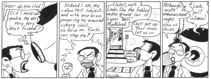Even though Madblood’s arm in the second panel is all kinds of wrong, my art’s getting slightly better. I’m drawing backgrounds, for one thing. And the one-quarter view of Madblood’s head in the third panel is okay, although I should’ve moved his ear and hairline forward and repositioned his body.