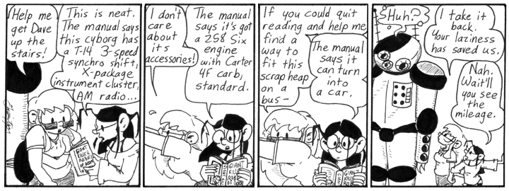 The specs Mell lists are actual features available for the 1976 AMC Gremlin. My favorite touch is the AM radio. I also like the way Mell is leaning on the panel border in the last panel, like she can’t even be bothered to pretend she’s not just a character in a comic strip.