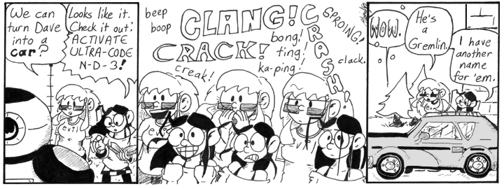 I love the series of expression in the center panel, which speak volumes without any dialog at all. Nothing like having the hypothetical coolness of a transforming car destroyed by the reality that it’s a Gremlin.
