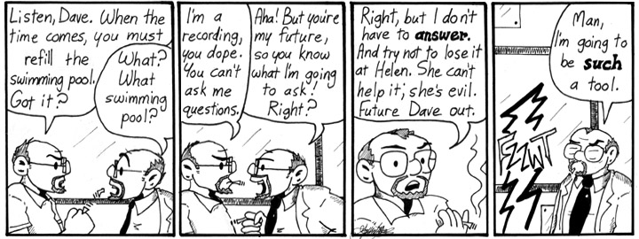 The only part of this strip I really like is Dave’s line in the first panel. Obvious humor is obvious. I really wish I’d drawn more detailed backgrounds in the future scenes. Some of these weeks, I was on a tight schedule. Or I was lazy.