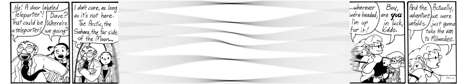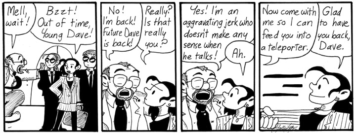 Once Dave [SPOILER] went mad and uploaded himself, I thought back to these strips and figured that Dave occupied the clone’s body while Future!Dave only claimed he was a recording so as not to reveal his madness to himself too soon. Dave’s got enough on his mind right now; going mad would just be a distraction at this point. Sure, that’d be one way for Future!Dave to change his past, but Dave is the rare mad scientist who succeeds when his plans go as expected, hence he plans carefully.