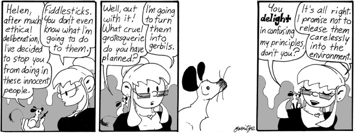 Helen threatening to turn her high-school class into gerbils was the very last plot element I came up with for this storyline, and it’s kind of appended hastily to everything else. Strangely, Helen never actually turns anyone into a gerbil at any point in Narbonic, although she does sometimes turn gerbils into people.