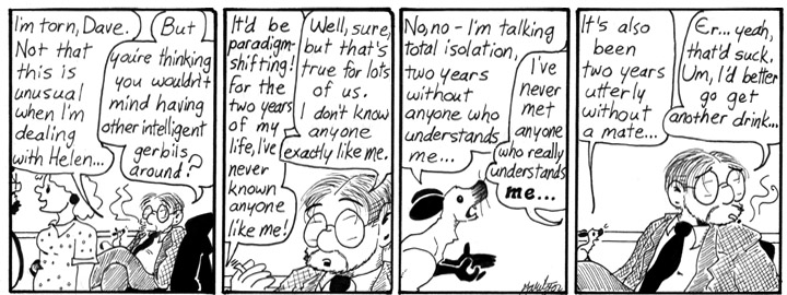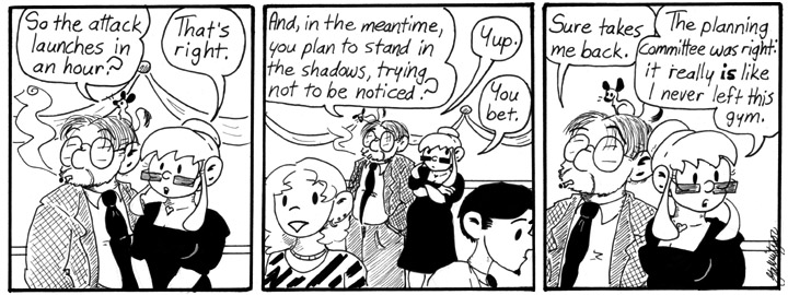 Another early strip. I like it when I can do a nice, simple, visually-oriented gag like this. Also, of course, I liked forcing Helen and Dave into quasi-romantic situations. This is basically fanfic of my own characters.