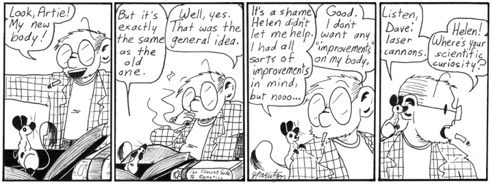 It’s out of character for Artie to think grafting laser cannons on Dave is a good idea, although it’s hard to deny it would be interesting. I must have written this strip early, before I had Artie figured out.