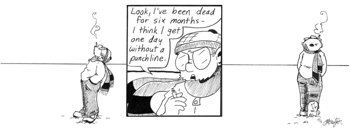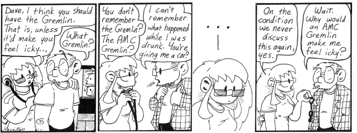 This strip looks really good except for Dave’s close-up in the center panel, which didn’t come out right at all. His head is too small for his body and his giant scarf. I was annoyed with this when I drew it, and I’m still annoyed. Otherwise, though, this is a pretty nice-looking strip. I almost never go for clean and simple when I ought to. Also, I should’ve given Dave curly cigarette smoke more often.