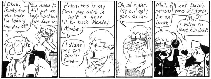 Aw, Helen’s got a soft spot for Dave. Or a soft spot for bugging Dave. This strip still looks pretty decent, art-wise, so I’m happy. I drew Andrew and myself on the magazine Mell’s reading in the last panel. Man, I did that a lot.