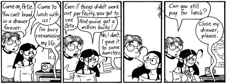 @Shaenon: Well, canonical in-universe evidence suggests that gerbils’ lives aren’t terribly complicated. Dave once correctly guessed that Artie’s answer to “What’s it like being a gerbil?” would be “Small. Furry. Alfalfa-scented.” If I didn’t like eating meats and cheeses so much, I’d be tempted to go be a gerbil, too.
