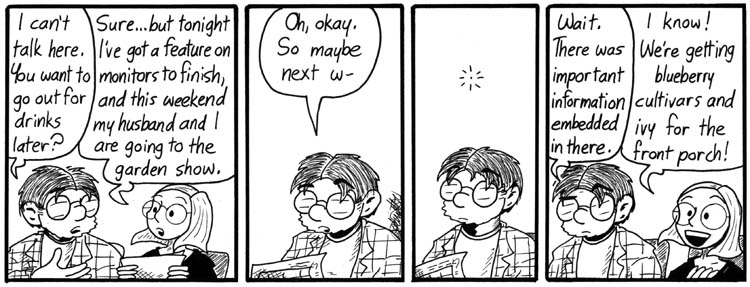 Seth is the one who didn’t pick up on Iris’s pointed mentions of her husband. He told Dave that Iris was single at the Halloween party, hence Dave’s misimpression. Anyway, this strip is based on the truth that sooner or later, even your nerdiest friends will get their social lives together and become cooler than you. Right now, for instance, all my friends are suddenly getting married. Even Jason Thompson, the basis for Freddy (who used to be scared of girls), got married last year. It’s pretty awesome.