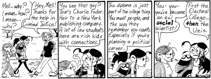 Now Mell’s just being a dick to Dave for no reason, stranding him on campus. She’s serious about her political ambitions, though. This is all a setup for later events, at least in one possible future.