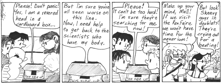 Not that Dave would’ve been able to carry a cell phone at this point. But, yeah, the increasing ubiquity of cell phones (although I still don’t own one) changed storytelling forever. I started incorporating them into the strip around the the Moon storyline, although Dave probably should’ve had one earlier. He’s the early-adopter type.