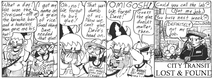 I still enjoy this week of strips. Like a lot of the strips from the “Dave is dead” period, this storyline is basically an exercise in seeing how long I can stretch a concept beyond its natural life span through painfully obvious plot devices, which I find amusing in a metatextual way. Admittedly, it might not be very entertaining for readers, but I need my laughs too.