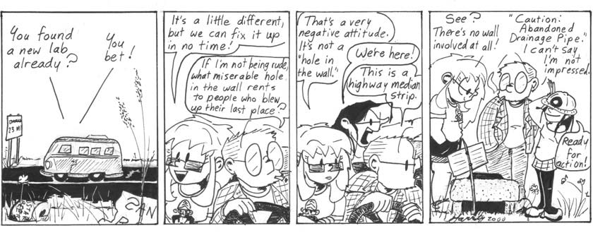 In the foreground of the first panel, you can see the “San Francisco or Bust” sign held by one of the ur-gerbils at the end of the previous storyline. Apparently, Helen and company just missed them. The can is labeled “___star Beer.” Again, I can no longer remember what this is in reference to. Nor can I read the highway sign, although I’m sure I chose “23 Miles” in deference to the Illuminatus! novels. Daily Helen Shirt Watch: Helen’s shirt bears the image of Mojo Jojo from “The Powerpuff Girls.”