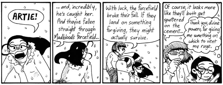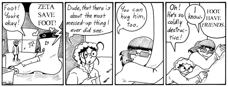 When this strip first ran, people made many inappropriate comments about the ladies’ love of Foot. I assure you that the Foot love is strictly platonic. Anyway, I swear I don’t laugh at my own strips much, but Mell’s line in the second panel still cracks me up. She’s seen a lot of messed-up things, you know.