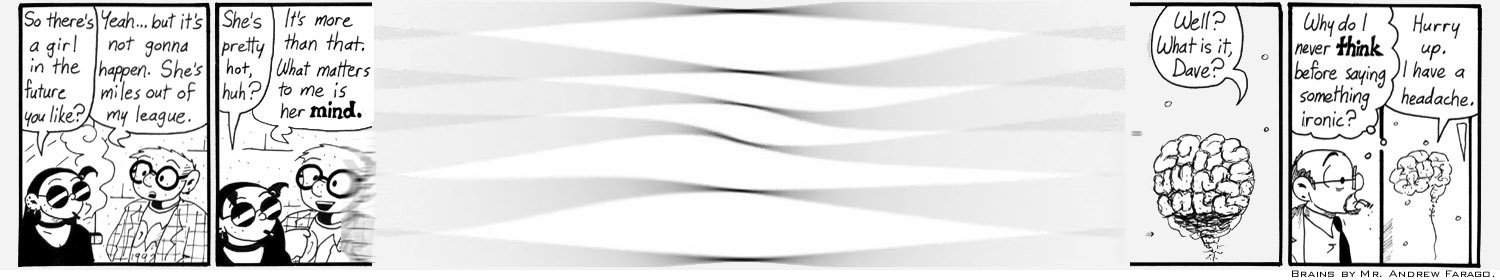 However, I was really bad at drawing brains, so I made Andrew draw Helen’s brain for me. I was worried that if I drew it, people wouldn’t be able to tell what it was, ruining this strip. I should’ve sucked it up and drawn the damn brain myself. A girl has to learn how to draw brains sometime.