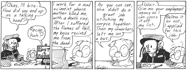 Whoever she is, she’s reading Film Threat in the first panel. Also, the last line indicates that she works for a temp agency, which may explain why she changes jobs so often. She was previously seen working retail in the last week of “Crystal of Marinia.”