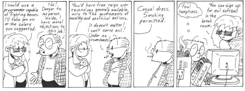 The personality sprites are just fun to draw. Even when my artwork was totally crummy (i.e., in these strips), I was always pretty good at drawing cute super-deformed things. It’s a lame talent, but not everybody can do it! John Byrne, for example, is way better than me at drawing Superman eating chunks of Kryptonite, but check out his drawings of children sometimes. They look like 40-year-old dwarfs. Evil dwarfs.