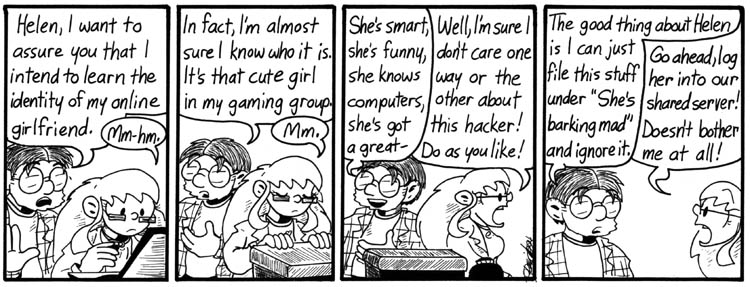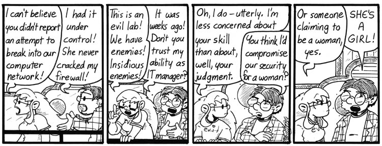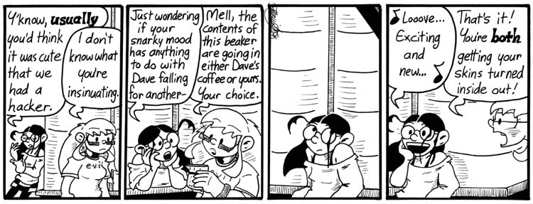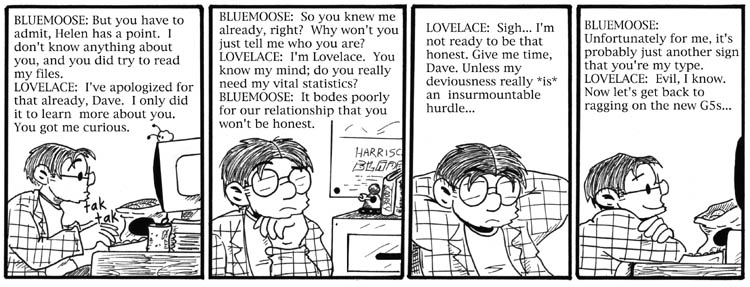 SPOILERS: I put a lot of references to stories about AIs into the backgrounds of the strips introducing Lovelace, as a not-especially-subtle clue to her identity. Here, Dave has the poster for Blade Runner on his wall. The books on top of the file cabinet are way too small for the titles to be legible here, but they’re something by Richard Kadrey, probably his Blade Runner-like cyberpunk novel Metrophage, and Orson Scott Card’s Speaker for the Dead.